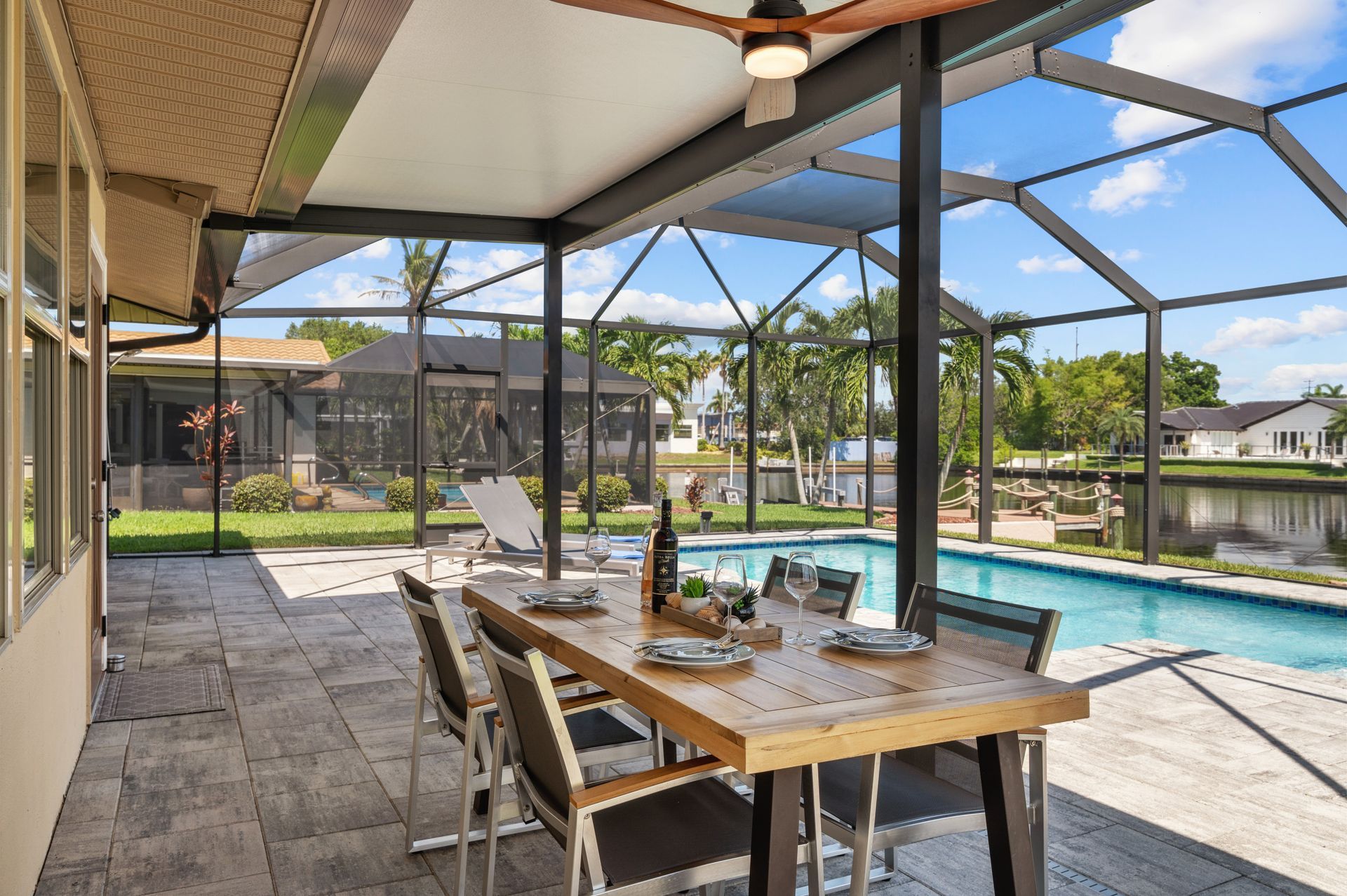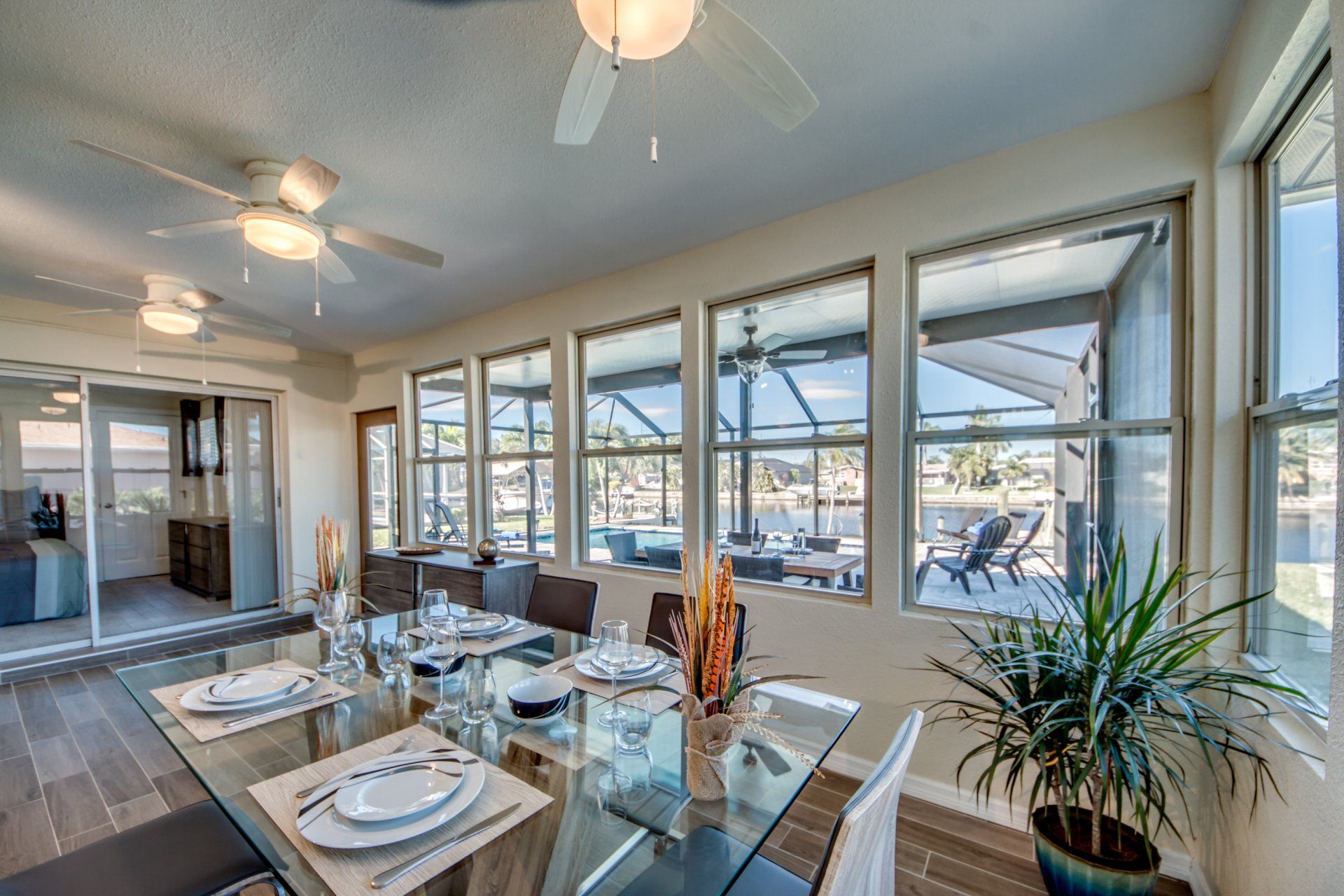 The dining table is located in the "Florida Room", which has a wonderful view on the terrace area, the garden and the water.
